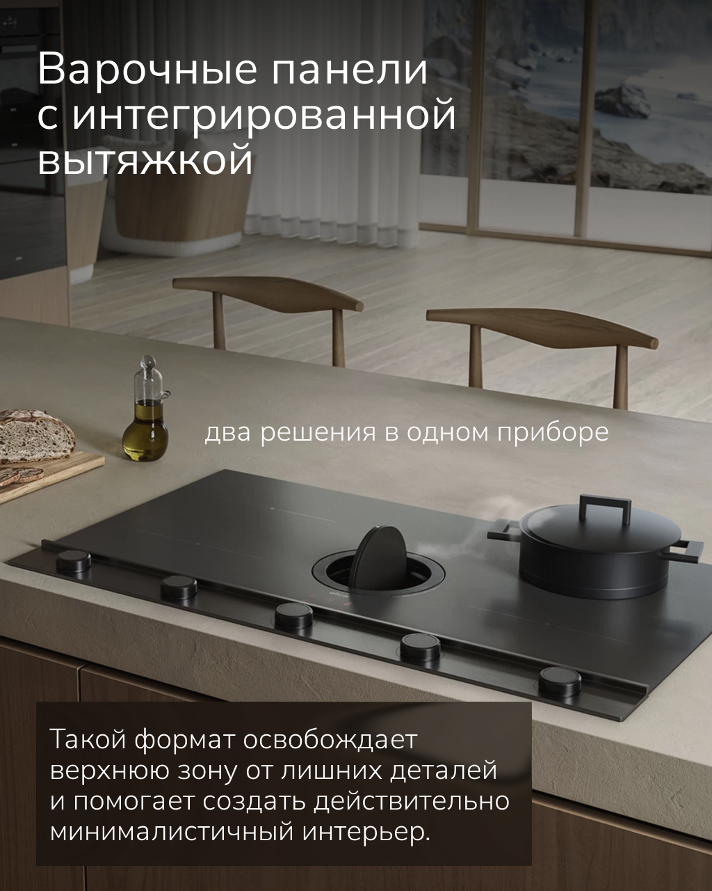 Линейка NikolaTesla объединяет варочную поверхность и систему отвода воздуха в одном приборе. Это удобно для современных кухонь-островов и пространств, где важно не перегружать верхнюю зону.