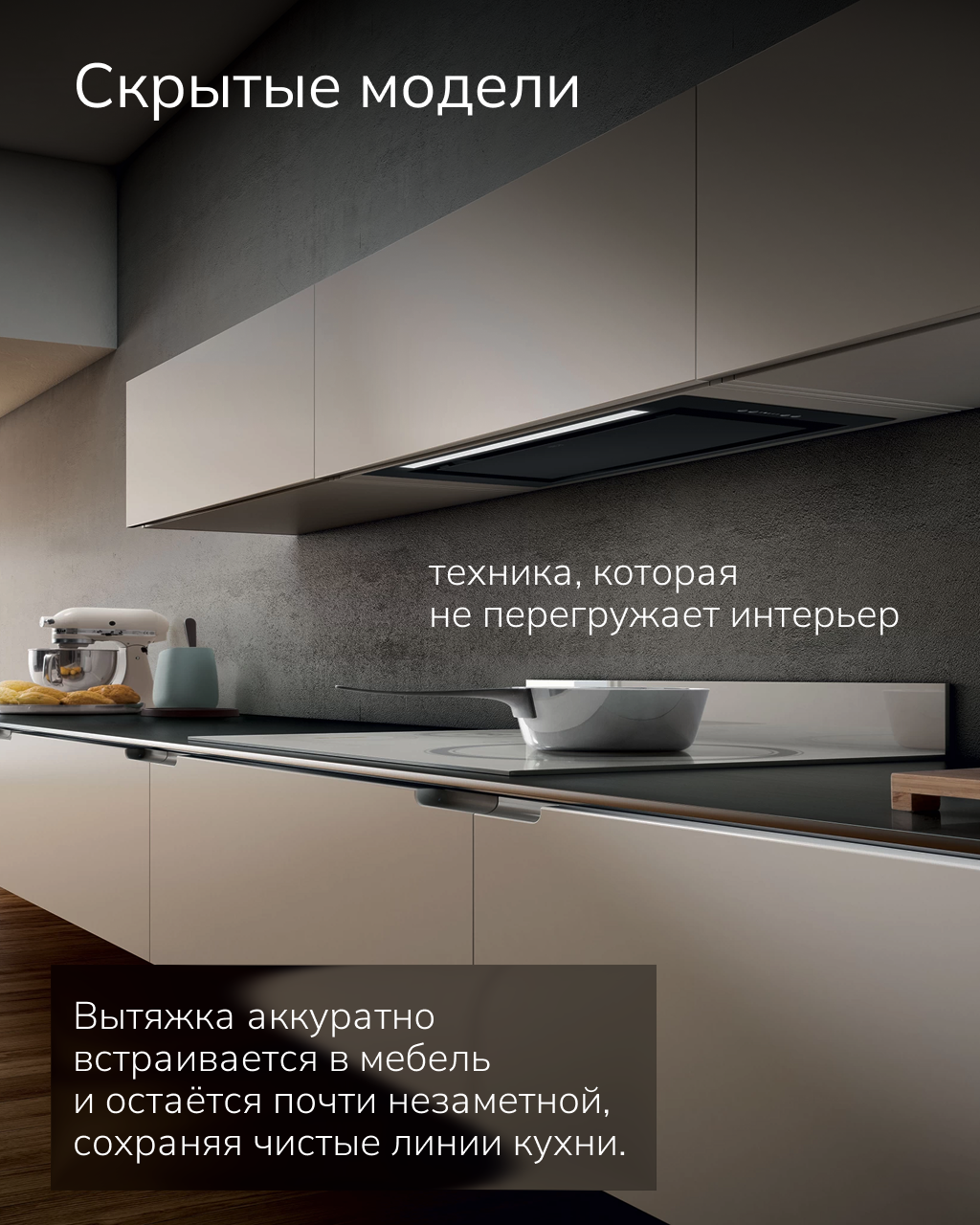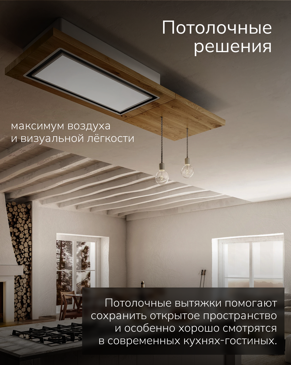 Формат, который буквально «растворяется» в пространстве. Такие модели встраиваются в потолок, освобождают обзор и поддерживают спокойный вид кухни.