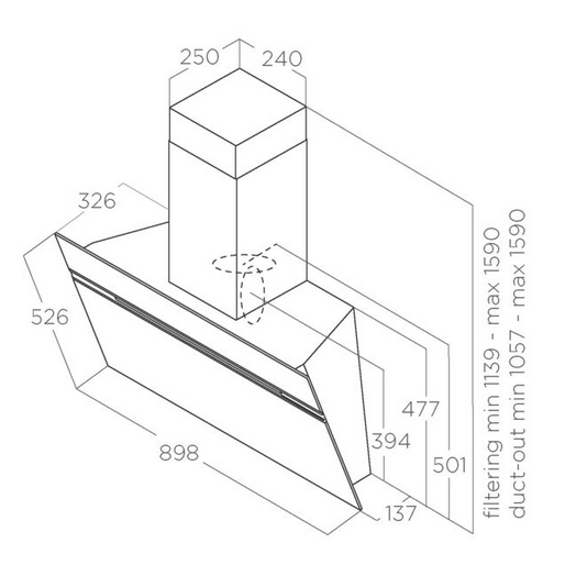 Уникальная конструкция позволяет установить вытяжку на высоте от 105,7 до 159 см, шириной 89,8 см и глубиной 32,6 см. Благодаря компактным габаритам она легко впишется в любой кухонный интерьер – как в открытый план, так и в традиционные кухни с закрытыми стенами.