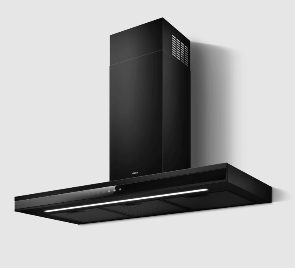 Дизайн модели разработан известным дизайнером FABRIZIO CRISÀ. Темная отделка с тонкими линиями придаёт кухне элегантный и современный вид, а ширина 89,8 см позволяет легко вписать вытяжку в большинство планировок без лишнего места.