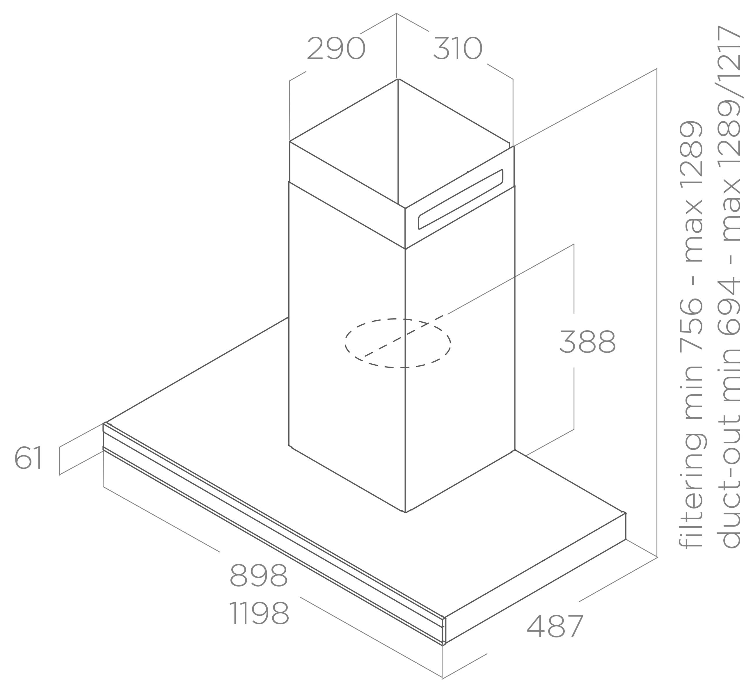 Размеры 119,8 × 48,7 × 75,6–128,9 см делают вытяжку универсальной для большинства кухонных планировок. Диаметр воздуховода 150 мм обеспечивает свободный поток воздуха и минимальный риск засорения.