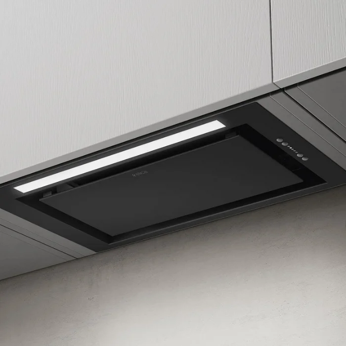 Модель отличается элегантным дизайном: панель выполнена в глубоком темном матовом оттенке, а механизм встраивания в подвесной шкаф позволяет полностью скрыть устройство под гарнитур. Благодаря этому вытяжка становится неотъемлемой частью интерьера и не привлекает лишнего внимания.